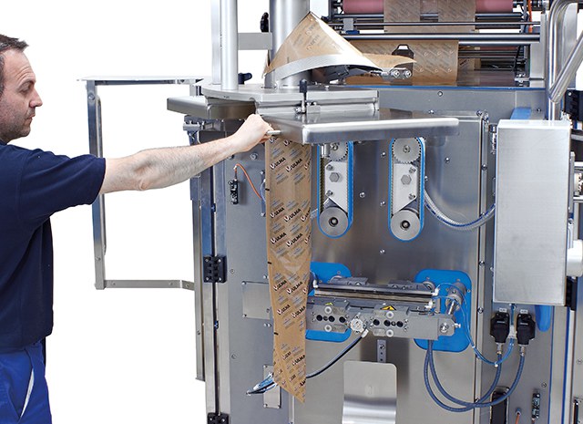 Hermetik tasarımlı dikey paketleme makinesi (VFFS), kolayca değiştirilir film şekillendirme kalıplı. Yüksek üretim hızlarında sürekli paketleme için tasarlanmıştır.