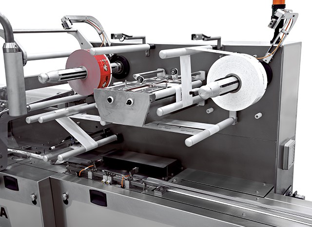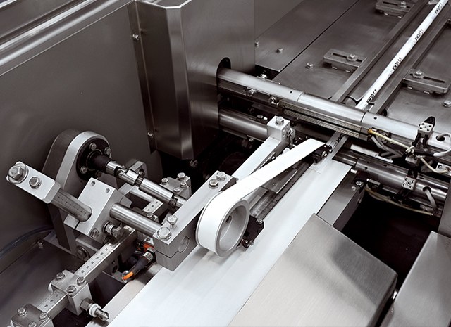 - Elektronik çok eksenli kontrolle senkronize edilmiş dört bağımsız servo motor (döner çeneler, sızdırmazlık silindirleri, besleme konveyörü ve motorlu makara tutucu) ile donatılmış elektronik makine.