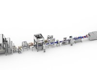 Hat, termoform makinelerini besleyen iki robottan oluşan robotik yükleme ünitesinin ürünleri aldığı, ürün biriktirme alanından ürünleri sayarak alan otomatik bir dilimleyici ile başlar.