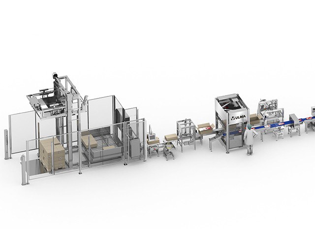 Paketler, robotize edilmiş bir muhafaza hücresi tarafından önceden oluşturulmuş karton kutulara paketlenmiştir. Paletleme yapan bir sonraki aşamaya geçmeden önce, bir kutu kapatma ekipmanı ile kapatılırlar.