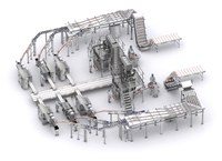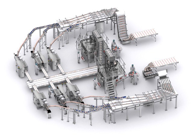Kurulum donuk hamburgerler için bir taşıma ve dağıtım sistemi içermektedir. Alınan ürünler rampalar ve hizalama konveyörleri ile farklı paketleme hatlarına dağıtılır.
