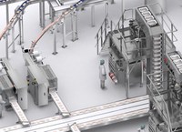 Birincil paketler, çoklu ambalaj için torbayı oluşturan dikey paketleme makinelerini besleyen çok kefeli teraziyi besleyen kaldırma sistemine giden bir konveyör içine yerleştirilir.