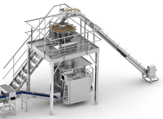 Dikey paketleme makinesi, çok kefeli teraziden beslenen ürün dozuna göre nugget paketlerini yapar.