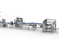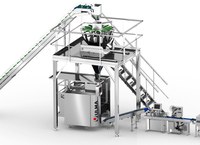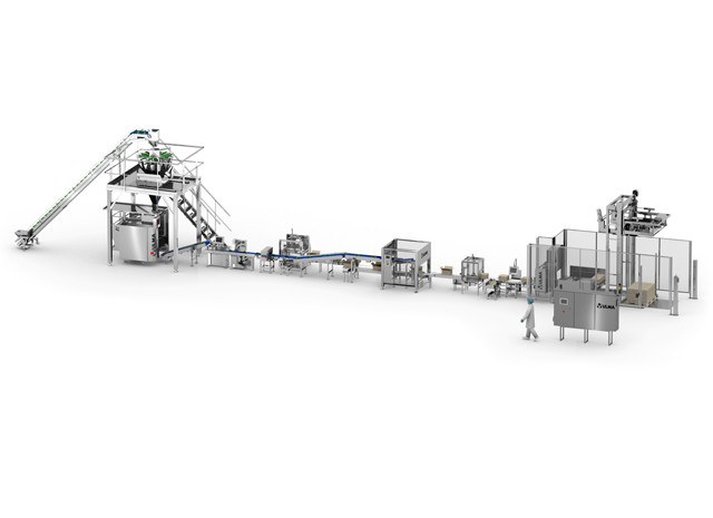Hat, dikey makinenin dondurulmuş ürün paketini yapması için gerekli ürün beslemesini gerçekleştiren çok kefeli terazi kombinasyonunu besleyen bir ürün asansörü ile başlar.