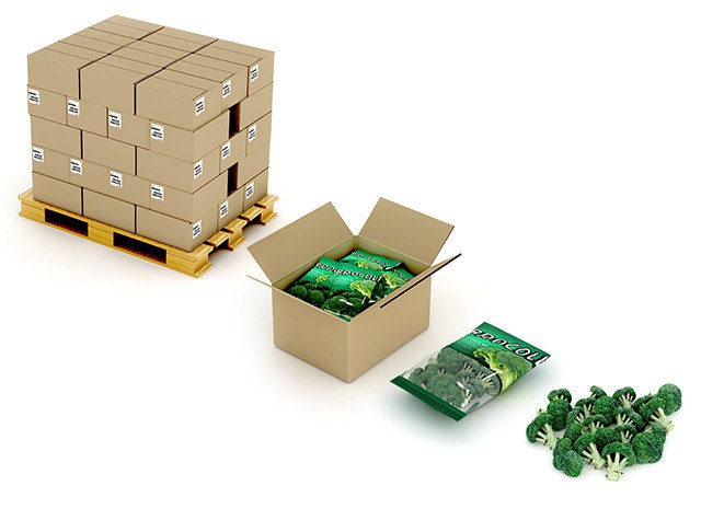 Daha sonra, bir açılır-kapanır sistem vasıtasıyla, dondurulmuş brokoli paketleri, mevcut hacmi optimize eden kutunun içine istiflenir.