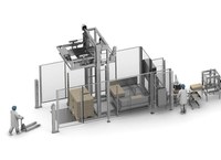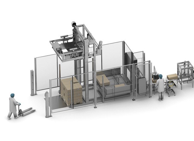 Mekanik paletleme sistemi, paketleri içeren karton kolileri alır ve paletleri ilgili istiflerle hazırlar, böylece bir operatör bunları bir transpalet aracıyla alır.