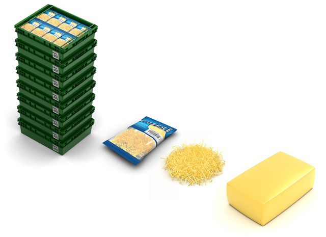 Kutu paketleme hücresi hem rendelenmiş peynir paketlerini hem de boş kasaları alır. Kutu paketlemesi, paket ve sandık boyutlarına göre paketlerin mozaiğini oluşturan bir robot tarafından gerçekleştirilir.