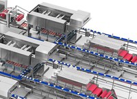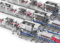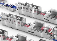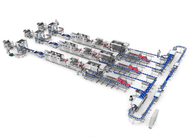 Taze ürünler için özel olarak uyarlanmış, temizleme işlerini kolaylaştıran bir konveyör sistemi sayesinde termoform makinesine doğru ürün akışı, dengeli bir şekilde dağıtan iki alana ayrılır.