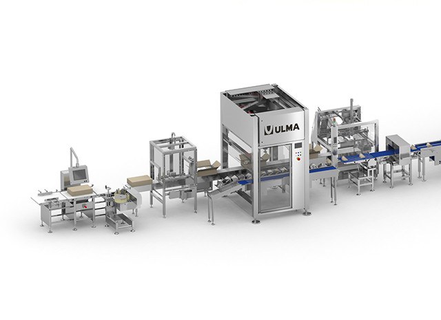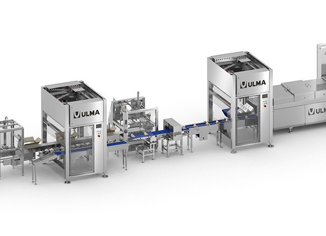 Paketlenmiş ürün, termoformdan üç sıra halinde çıkar ve bir robot vasıtasıyla, her döngü için bir sıra toplanır, öndeki konveyor bandına bırakmadan önce paketler tek bir sıra halinde hizalanır ve döndürülür.