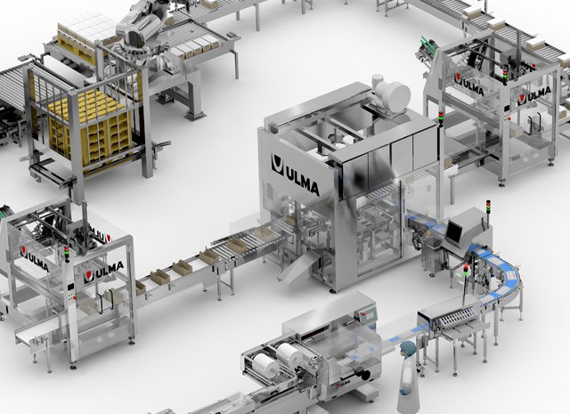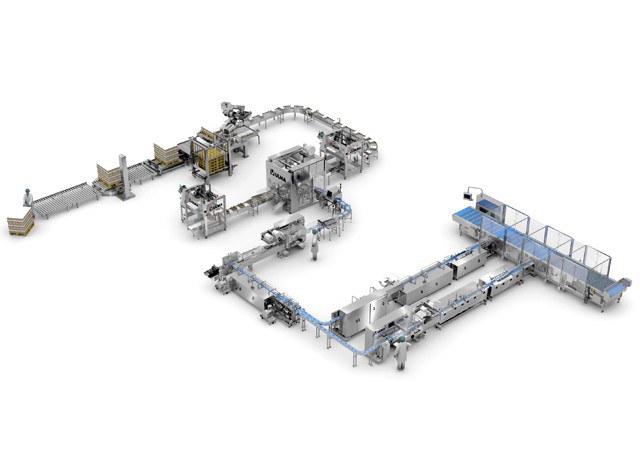 Tekli paketlerin gruplanmasını gerçekleştiren bir sistem aracılığıyla, üçüncü bir flowpack paketleme makinesi ile ikincil paketleme yapılır.
