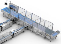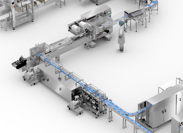 Sıra dağıtım sistemi, ürünleri ana ürün konveyöründen çıkarır ve iki ana flowpack paketleme hattını besler.