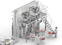 Tekli paketler, konveyör bantlar ve kovalı elevatör vasıtasıyla, kurulmuş olan çoklu ambalaj dozlarını gerçekleştiren çok kefeli terazi kombinasyonlarına taşınır.